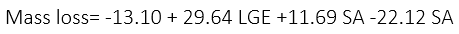 The loss of fruit mass is a critical factor in conservation, since ofwhat this content, the more degraded the fruit, and, therefore, it will have a shorter shelf life. This loss is mainly related to the loss of water from the fruit into the environment, inducing sensory changes in fresh fruits, in addition to reducing yield. The results of the regression analyzes for mass loss indicated a significant effect of the interaction between the LGE and SA factors, as indicated in equation 6.
