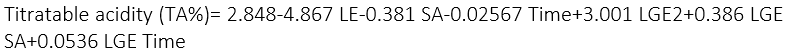 The titratable acidity, important in the sensory quality of the fruit, as it is related to the acidic taste, underwent a significant effect (p < 0.05) from the interaction between the LGE and SA factors and between the LGE and the time for the evaluated strawberries. Below is the regression equation (8):