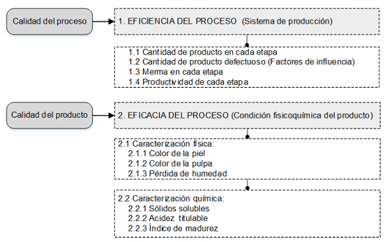 Los indicadores que reflejen aspectos de calidad del proceso y producto son altamente relevantes para determinar la calidad de los alimentos inmersos en una cadena alimentaria. Tomando en cuenta lo anterior, para la calidad del proceso el indicador de eficiencia suele emplearse para conocer qué tan bien se utilizan los recursos en una industria, unidad de negocios o proceso y su mejora se encuentra frecuentemente asociada con la corrección de problemas de calidad (Aramyan et al., 2007; Chase et al., 2009; Heizer et al., 2009). En cuanto a la calidad del producto, esta viene dada fundamentalmente por la evaluación de las condiciones de la operación real de la cadena y su atención a los requerimientos del cliente, normalmente estipulados en normas o estándares nacionales e internacionales.