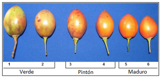 - Calidad del producto: Se tomaron muestras de fruta (n=90) en 3 cosechas diferentes en los meses de marzo y abril, durante 7 etapas de la cadena (cosecha–selección, clasificación, limpieza, empaque, almacenamiento, transporte y comercialización). Con base en la norma nacional vigente (NTE INEN 1909, 2009), los frutos se cosecharon entre los grados de madurez 3 y 4 (pintón), según la figura 2. Los frutos se dividieron en 2 calibres: grande (diámetro ≥55mm y longitud ≥70mm) y mediano (45<diámetro<55 mm y 60<longitud<70 mm). En los frutos se analizó: peso (gramos), sólidos solubles (AOAC 932.12), acidez titulable (AOAC 942.15) e índice de madurez (relación entre acidez y sólidos solubles).
