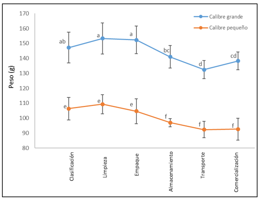 Desde la cosecha-selección y clasificación hasta la comercialización se registró un 13 y 6 % de reducción de peso en el calibre mediano y grande, respectivamente. Las variaciones de peso, generalmente pérdidas, son atribuidas a la transpiración del vapor de agua y de los compuestos volátiles (Lufu et al., 2020). El enfriamiento en la etapa de almacenamiento y comercialización detendrá la respiración de la fruta y; en consecuencia, la pérdida de humedad y masa. La tasa de respiración es un aspecto importante a tener en cuenta, pues en la medida en que la fruta presente una alta intensidad respiratoria, las reservas alimenticias se agotarán pronto y la fruta iniciará la etapa de senescencia o muerte. Este factor está fuertemente ligado con las condiciones de temperatura y concentración de los gases circundantes. Un adecuado control de la temperatura conduce a minimizar la tasa de respiración de la fruta para prolongar su vida útil por lo que se estudian diferentes tecnologías como coberturas comestibles, óxido nítrico, aceites esenciales y atmósfera modificada, entre otras, con el fin de reducir pérdidas económicas causadas por la pérdida de peso (Kahramanoğlu, 2019; Shah y Hashmi, 2020; Sahu et al., 2020).