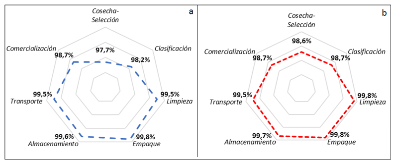 Los resultados de la eficiencia que caracteriza la calidad del sistema productivo desarrollado a lo largo de las etapas de la cadena del tomate de árbol se presentan en la Figura 4. Los factores atribuibles a la merma del producto y que caracterizan la calidad del proceso son identificados del tipo: físico (corte, abrasión, deformaciones y picaduras), biológico (ataque de plagas), químico y/o mecánico (secado, magulladuras, entre otros). El promedio de tres cosechas para las etapas: cosecha–selección, clasificación y comercialización representan las de menor índice de eficiencia en los dos calibres estudiados; en contraposición las etapas de limpieza, empaque, almacenamiento y transporte son las de mayor eficiencia, superando el 99% en todos los casos.