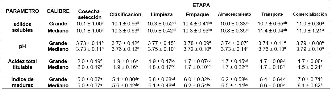 - Análisis estadístico de la calidad del producto: Para la calidad del producto se realizó el análisis de las variables independientes (cosecha, calibre y etapas de la cadena alimentaria) y dependientes: peso, % sólidos solubles, % acidez titulable e índice de madurez. Las mediciones se realizaron por triplicado. Los datos fueron analizados mediante un ANOVA multifactorial con arreglo unifactorial completamente aleatorizado para determinar diferencias significativas entre las cosechas, calibres y etapas de la cadena alimentaria con una significancia estadística al 95%. Se utilizó el programa Statgraphics Centurión XV.