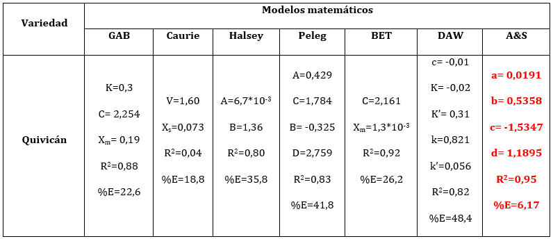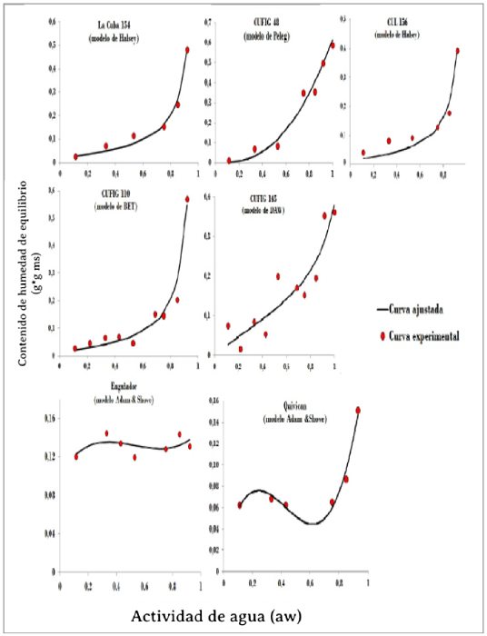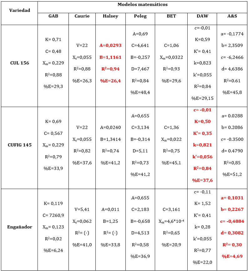 Se ajustaron los datos experimentales a diferentes modelos matemáticos en función de los valores de % E y R² como se muestran en la Figura 1 y en la Tabla 4. Según la clasificación de Brunauer et al. (1940) se obtuvo para las semillas de las variedades Engañador y Quivicán isotermas de Tipo II, mientras que para el resto fue de Tipo III.
