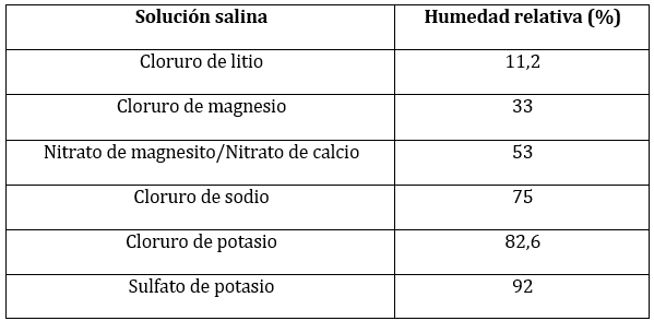 En la determinación de la isoterma de sorción se utilizó la técnica analítica de equilibrio higroscópico. Para ello se colocaron 2,15±1,0 g semillas de frijol de cada variedad por triplicado en desecadoras con diferentes soluciones salinas saturadas a la temperatura ambiental hasta alcanzar el equilibrio (Tabla 1). Se determinó el peso de la muestra diariamente, hasta que se obtuvo un peso constante y posteriormente se calcularon los contenidos de humedad mediante el método A.O.A.C. (1990).