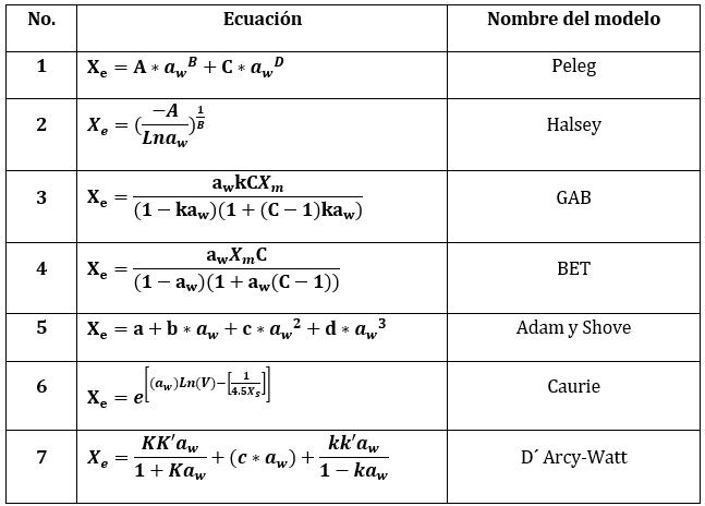 Los modelos empíricos, semiempíricos y experimentales, son representaciones de los procesos reales con distintos niveles de descripción que relacionan siempre el carácter del fenómeno físico, en este caso, la sorción de humedad (Guillerme y Nicolin, 2020). Su ajuste matemático depende de los parámetros termodinámicos, la especie vegetal en estudio, su composición química y los aspectos botánicos. De ahí la importancia que se realice de manera individual.