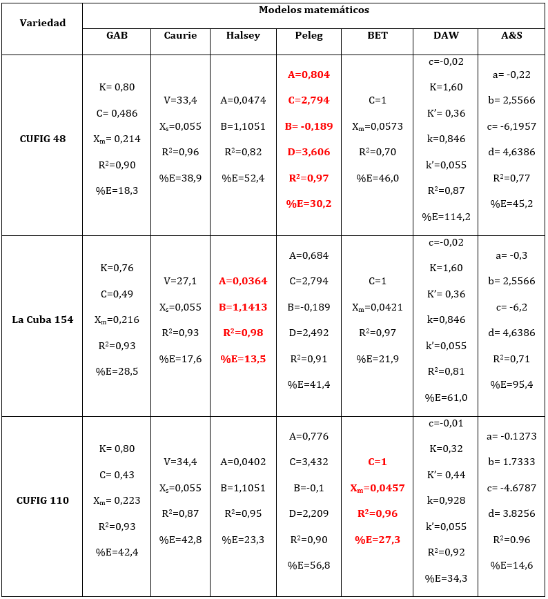 Los modelos de Peleg, Halsey, BET, DAW y Adam y Shove caracterizan el proceso de adsorción y establecen el rango de contenido de humedad que deben presentar las variedades CUFIG 48, La Cuba 154, CUFIG 110, CUL 156, CUFIG 145, Engañador y Quivicán para poder almacenarse y obtener una máxima durabilidad a temperatura ambiente.