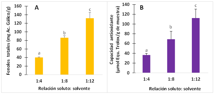En la figura 1(A) se observa que existe diferencia significativa (p≤0.05) en la cantidad de fenoles totales de las tres relaciones, debido a que en la cinética de lixiviación existe un equilibrio, el soluto requiere de cierta cantidad de solvente para la extracción, este comportamiento se debe a la mayor cantidad de solvente limpio se puede arrastrar más compuestos sin llegar a un equilibrio (Fonseca et al. 2014). Por lo que se observa que en la relación de 1:12 soluto: solvente hay mayor cantidad de fenoles aproximadamente 130 mg de AG/g de muestra, existiendo una relación directamente proporcional a mayor cantidad de solvente, mayor es la concentración de fenoles en los extractos.