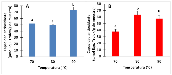 En cuanto a la capacidad antioxidante (figura 2A) a diferentes temperaturas por el método de infusión, se observa que no presentan diferencia significativa (p≥0.05) en la concentración de este compuesto en las infusiones obtenidas a las temperatura de 70 y 80°C, sin embargo, la infusión preparada a 90°C si mostró diferencia significativa (p≤0.05), los compuestos antioxidantes tienen mayor solubilidad en el empleo de altas temperaturas que favorecen la extracción de estos compuestos, presentando alrededor de 30 % más capacidad antioxidante comparada con las otras dos condiciones, siendo aproximadamente de 73.02 μmol equivalentes Trolox/g de muestra. El incremento de temperatura ayuda a solubilizar compuestos y también puede contribuir a la activación de enzimas que participen de la descomposición de los compuestos complejos que crean puentes de hidrógeno con los compuestos fenólicos, facilitando la extracción de éstos (Muñoz et al., 2015).