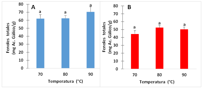 En la figura 3(B) se presentan los resultados obtenidos del contenido de fenoles totales a partir de la extracción por percolado, en la cual se observa que no presenta diferencia significativa (p≥0.05) en el contenido de fenoles por efecto de la temperatura, siendo los tratamientos a 80 y 90 °C los que obtuvieron mayor contenido de estos compuestos con 52.5 y 50.3 mg de AG/g respectivamente. Mientras que los extractos preparados a 70 °C mostraron un contenido de fenoles de 44.3 mg de AG/g, mostrando una tendencia similar a los extractos obtenidos por el método de infusión, siendo importante destacar que el empleo de altas temperaturas favorece la extracción de los compuestos antioxidantes, que en este caso se verían representados por los fenoles presentes en la muestra (Muñoz et al., 2015).