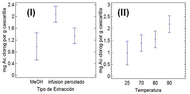 En la figura 4(II) se registró que no existe diferencia significativa entre las temperaturas de 80 y 90 °C, reflejando un aumento de la concentración de este compuesto con la temperatura, esto puede deberse a la solubilidad de este compuesto a altas temperaturas, sin embargo una temperatura mayor como es en el caso del tueste de los granos, la tendencia muestra que la concentración del ácido clorogénico disminuye conforme avanza el nivel de tostado, la reducción de este compuesto no sólo se da por la degradación atribuida a la acción de la alta temperatura, sino porque también participa como sustrato en la formación de melanoidinas (Budryn et al., 2009).