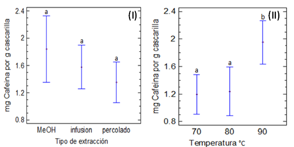En cuanto a la influencia del método de extracción para la cafeína (figura 5I) se pueden considerar iguales ambos tipos de extracción utilizados, ya que no se observan diferencias significativas (p≤0.05) sin embargo, el valor más alto de extracción de cafeína se obtuvo con la extracción con metanol, debido a que este compuesto ha mostrado mayor solubilidad en solventes orgánicos como el metanol y el cloroformo(Bravo, 2003). Por otro lado, en la figura 5(II) se muestra la extracción de cafeína, se registró que aumenta al realizarse a 90°C, esto debido a que ha mostrado tener mayor solubilidad a altas temperaturas (Bravo, 2003).