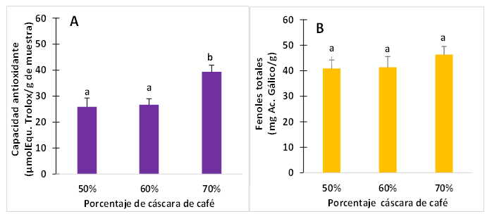 La capacidad antioxidante en las tisanas elaboradas con la cascarilla de café (figura 6A) a diferentes porcentajes de cascarilla (50, 60, 70 %) por el método de infusión, podemos observar que no presentan diferencia significativa (p≥0.05) en el contenido de capacidad antioxidante las tisanas con 50 y 60 %, sin embargo, la infusión preparada con mayor cantidad de cascarilla (70 %) si mostró diferencia significativa (p≤0.05) presentando más capacidad antioxidante comparada con las otras dos condiciones, mostrando que al aumentar el porcentaje de cascarilla en la bebida aumenta este valor, siendo aproximadamente de 39.32 μmol equivalentes Trolox/g de muestra. En cuanto a la extracción por infusión de las tisanas a tres diferentes porcentajes, se presentan los resultados obtenidos del contenido de fenoles totales en la figura 6(B), no mostrando una tendencia, ya que entre porcentajes no presentan diferencia significativa (p≥0.05) en el contenido de fenoles, sin embargo, la tisana que presentó mayor contenido de estos compuestos también fue la formulación con mayor contenido de cascarilla (70 %) con 46.32 mg de AG/g.