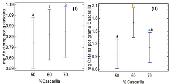 En el contenido de cafeína obtenido por el método de infusión (figura 7II) se registró que los mayores porcentajes de este compuesto se presentaron en las tisanas con un mayor porcentaje de cascarilla de café, la formulación con 60 y 70 % de cascarilla no presentó diferencia significativa entre sí (p≤0.05), por lo que se pueden considerar como tratamientos iguales. Sin embargo, los extractos obtenidos con el tratamiento a 60 % presentaron mayor cantidad de cafeína, la cual fue aproximadamente del 40 % más que la formulación con el 50 % de cascarilla.
