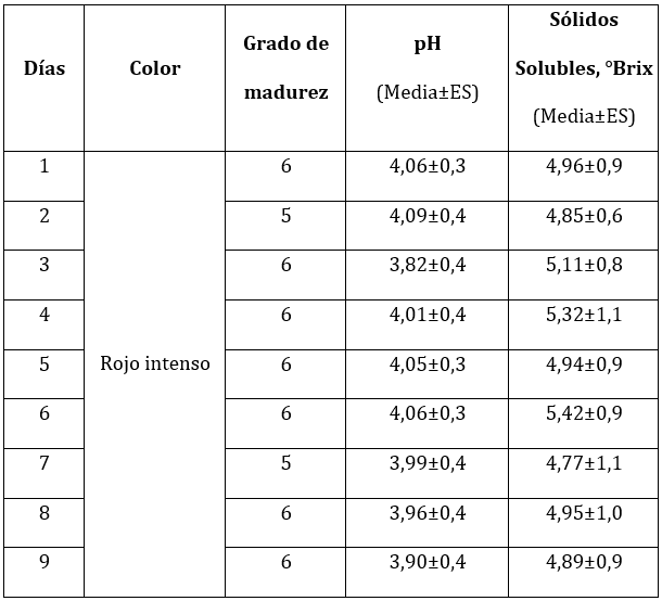 La NC 735 plantea que para tomate destinado a industria el índice de pH debe ser menor de 4,2. En la Tabla I los valores de todos los días cumplen con la normativa, pero existe variabilidad entre ellos. Esto pudo deberse a la mezclas de variedades existentes en una misma caja, a la intensidad de la luz y el contenido de potasio durante el período de crecimiento del tomate, ya que ambos factores influyen en el contenido de ácidos y azúcares.