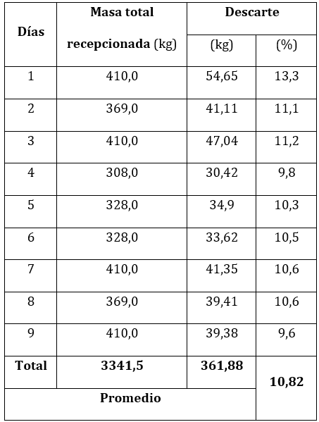 La Tabla II muestra la masa diaria recepcionada y su relación con la masa total descartada.