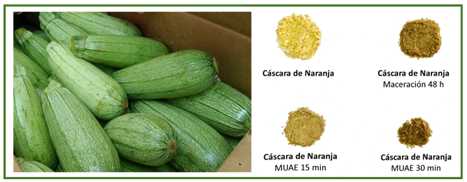 Resumen: Se elaboraron Recubrimientos Comestibles (RCs) a base de quitosano (Q), alcohol polivinílico (APV) y extractos de cáscara de naranja (CN) para mantener la calidad de la calabaza italiana, además de dar un uso a los residuos generados en la extracción de jugo de naranja. Los extractos de CN fueron obtenidos por extracción asistida de microondas y ultrasonido (MUAE) por 30 min. Los frutos de calabaza fueron recubiertos con agua como testigo (T1), Q+APV (T2) y Q+APV+CN (T3) y almacenados a 12 °C por 15 días. Cada 5 días se evaluó el porcentaje acumulado de pérdida de peso (%), pH, acidez titulable (%), azúcares totales (°Brix), color en la cáscara del fruto (L*, a*, b*, Hue* y Croma*), firmeza (N) e Índices de Pudriciones (IP) y Marchitamiento (IM). El RC T2 logró reducir 1.24 veces la pérdida de peso respecto a T1, mientras que T2 fue de 1.37 veces para el día 10. Los RCs no afectaron el color ni la firmeza, aunque sí influyeron en el pH, los ácidos orgánicos y azúcares totales. Sólo T1 tuvo IP (0.1) y un IM mayor (0.3), T2 fue 3 veces menor en T3 no se presentó después de 15 días de almacenamiento. El recubrimiento con extracto de cáscara de naranja podría ser una alternativa tecnológica para mantener la calidad de las frutas y hortalizas, al mismo tiempo que se valoriza un desecho de la industria de los jugos de naranja.