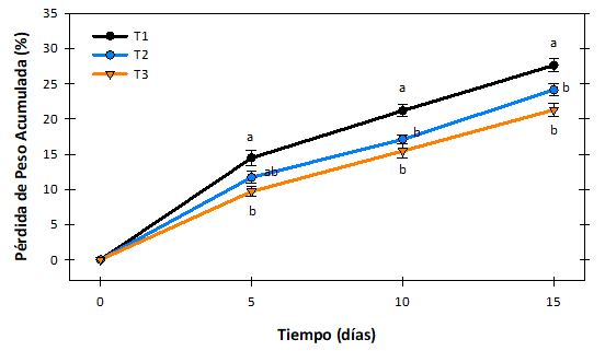 El mayor incremento en la pérdida de peso se observó en los frutos testigo (T1) alcanzando 27.6 % a los 15 días de almacenamiento (Figura 2). T3 presentó diferencias significativas respecto a T1 durante todo el almacenamiento con la menor pérdida de peso. T2 fue diferente estadísticamente de T1 a partir del día 10, sin embargo, entre T2 y T3 no se observaron diferencias (p≥0.05). Estos resultados coinciden con Madera-Santana et al., (2023) donde la aplicación de recubrimientos de quitosano, agar y aceite de tomillo en frutos de aguacate redujo la pérdida de peso en casi un 30 %, atribuida a las propiedades de barrera del recubrimiento. Además, la mayor diferencia entre el testigo y los frutos con recubrimiento se observó a los 10 días de almacenados a 12 °C. T2 perdió 1.24 veces menos peso que T1, mientras que en T3 la pérdida fue 1.37 veces menor.