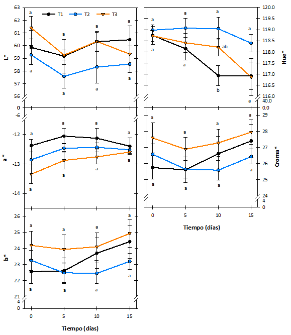 El color de la cáscara de los frutos no se vio afectado con los RCs aplicados, incluso con la adición de extracto de naranja (Figura 3). En pruebas preliminares, se obtuvieron películas conteniendo CN, las cuales presentaron una coloración amarillo-naranja, sin embargo, aparentemente esto no influyó en los resultados de color. No se observaron diferencias significativas en la mayoría de los parámetros evaluados, aunque sí ciertas tendencias. Por ejemplo, T1 y T3 se comportaron semejante y con valores mayores de luminosidad que T2. Valores menores en el parámetro a* (color verde) se observaron en T3, aunque también presentó valores más positivos en b* y que están relacionados con el color amarillo. El cambio de tono (Hue*) fue menor en T2 durante el almacenamiento y la intensidad del color se vio más favorecida en los frutos con T3 (Croma*). A pesar de estas tendencias, los cambios en las variables no fueron suficientes para ser de importancia, lo cual puede resultar conveniente comercialmente ya que no afectó el aspecto del fruto.