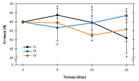 Al igual que la anterior variable, este parámetro aparentemente no se vio afectado por los RCs ya que no se observaron diferencias significativas en los resultados (Figura 4). Quizás debido al método de análisis, las tendencias de la firmeza durante almacenamiento no guardan ninguna relación con los resultados de pérdida de peso. Salvo la que presentó T1, al disminuir del día 0 de 59.9 N a 51.1 N para el día 15, aunque nada concluyente debido a la variabilidad de los resultados. De ahí que no se pueda afirmar categóricamente que T2 presentó una retención de la firmeza mejor que T3 o T1.