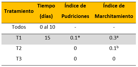 En la tabla 2 se puede apreciar que sólo hasta después de 10 días de almacenamiento se pudo apreciar la presencia de pudriciones y el marchitamiento de los frutos. Para el día 15 las calabazas testigo presentaron un índice de pudriciones de 0.1, mientras que no se apreció con las calabazas con RCs. Como era de esperarse, la acción del quitosano influyó, sin embargo, no se fue posible establecer un efecto sinérgico de este con el extracto de CN. Por otro lado, los resultados respecto al índice de marchitamiento aparentan una estrecha relación con lo observado en la pérdida de peso dado que el mayor índice lo presentan las calabazas T1. Además, T2 presentó un índice de marchitamiento 3 veces menor que T1, mientras que en T3 no fue observado este deterioro de la calidad.