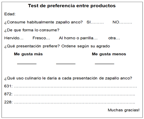 En la figura 2 se presenta el modelo de las fichas utilizadas para las pruebas de preferencia de formas de presentación del zapallo anco mínimamente procesado.