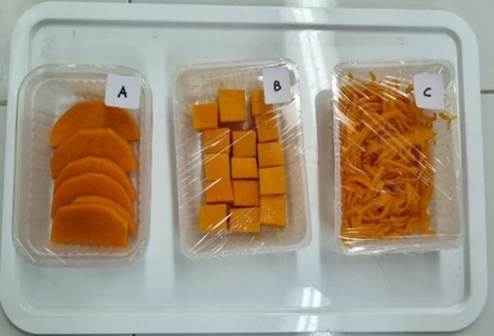 Abstract: The pumpkin (Curbubita moschata) is successfully developed in Santiago del Estero-Argentina, and its production is characterized by high quality and performance. This product is sold fresh whole and is traditionally consumed cooked in water. Due to its pleasant flavor (semisweet), it is widely accepted among consumers, being a potentially versatile product to be consumed fresh or minimally processed (VMP). In this work, the preference and forms of consumption of cut pumpkin in different presentations as VMP were evaluated. Sensory tests were carried out with untrained judges, using an ordering test for three types of cuts: 0.5 cm slices, 1 cm³ cubes and coarse grating. The results showed that there were no significant differences in preference between slices and cubes, and both were preferred over grated. At home, slices are mostly consumed baked (68%), cubes are more versatile (51% cooked in water) and grated is mainly used in salads (72%). Additionally, when preference tests were conducted between grated pumpkin and grated carrots, no significant differences were found. Therefore, grated pumpkin could also be used in salads alone or in combination with other vegetables, even carrots. This information may be useful for other research that seeks to offer new products made as VMP, as well as increase the useful life of the product studied here and improve its acceptance by consumers.