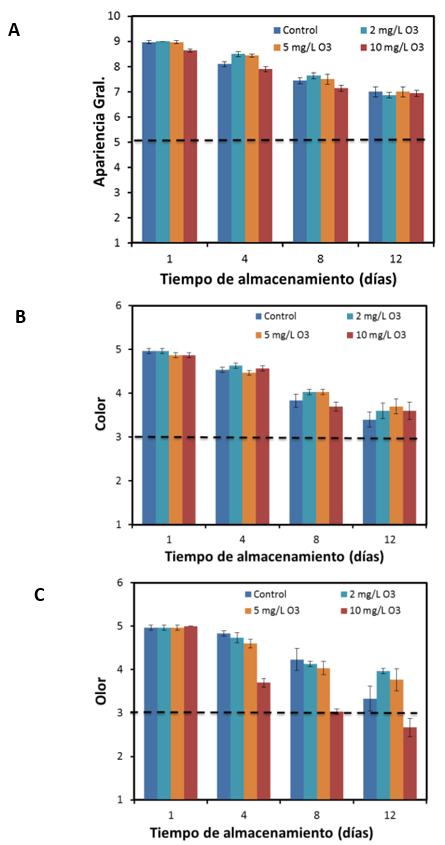 La apariencia general y el color presentaron valores superiores al límite de aceptación para su comercialización durante los 12 días a 5 °C, sin encontrarse diferencias significativas entre los tratamientos con O3 y el control (Fig. 1A y B). Al evaluarse el atributo olor, las muestras tratadas con O3 registraron los valores más altos al cabo de los 12 días, a excepción de la concentración más alta de 10 mg L-1 , ya que al octavo día presentó un valor de aproximadamente 3 (límite establecido) y continuó disminuyendo hasta el final del almacenamiento. Las muestras control presentaron un valor cercano al límite de aceptabilidad a los 12 días a 5 °C. Estos resultados están de acuerdo con Ali et al. (2014), quienes encontraron que frutas de papaya tratadas con diferentes concentraciones de O3 (2.5 y 3.5 mg L-1) mostraron puntajes altos en los atributos sensoriales después de 12 días de almacenamiento a temperatura ambiente. En este sentido, De Santis et al. (2021) también reportaron que el ozono gaseoso (2,14 μg m-3 durante 20 h por día durante 4 días) afectó levemente el perfil sensorial del ajo tratado, así mismo se reportó que en zanahorias tratadas con 1-5 mg L-1 no se registró pérdida de color (De Souza et al., 2018).