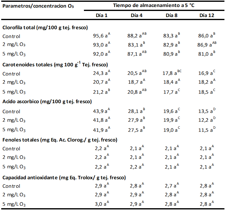 Se observó que inicialmente los diferentes tratamientos con ozono no afectaron el contenido de AA, presentando valores similares al control (43,9 mg ácido ascórbico 100 g-1 tej. fresco). Luego el contenido de AA disminuyó significativamente tanto en el control como en las muestras tratadas con O3 durante el almacenamiento a 5 °C. Sin embargo, al final de la conservación, todos los tratamientos presentaron reducciones de aproximadamente 70 % con respecto a los valores iniciales, sin encontrarse diferencias significativas entre ellos (Tabla 2). En ese sentido, Ummat et al. (2018) reportaron que en estudios llevados a cabo con pimientos verdes la aplicación de 2.4 mg L-1 O3 durante 5 min retuvo el contenido de AA. Así mismo, nuestros resultados están de acuerdo con lo reportado por Karaca y Velioglu (2020), quienes observaron disminuciones entre el 73 y 88 % en el contenido de AA en hojas de perejil tratadas con ozono acuoso (12 mg L-1) al final del almacenamiento (15 días). Estos autores reportaron que esta disminución se debería a la alteración de la integridad de los tejidos de la planta, lo que resultó en el contacto del ácido ascórbico con las enzimas degradantes.