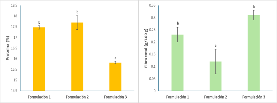 En el presente estudio se evaluó el contenido de proteínas en tres tratamientos de snacks horneados con diferentes proporciones de harina de arveja y avena (Figura 1). Los resultados indicaron que la Formulación 2 (F2) exhibió el contenido de proteínas más alto con un 17.7 %, seguido por F1 con un 17.47 % y F3 con un 15.82 %. Estas variaciones en los contenidos de proteínas podrían atribuirse a las diferentes proporciones de ingredientes utilizadas en cada tratamiento, destacando la influencia directa de la formulación en el perfil nutricional del producto. Además, la comparación de estos resultados con el estudio de Calizaya y Camones (2020), donde el contenido de proteínas en un snack con harina de quinua, kiwicha y arveja extruida fue del 16.8 %, sugiere que los snacks formulados presentan un perfil nutricional competitivo y comparable en términos de contenido proteico. Asimismo, estos resultados se compararon con los de Astiz et al., (2022), quienes evaluaron los efectos de diferentes parámetros de extrusión en sus snacks a base de maíz, chocho y papa con diferencias significativas. En su investigación, lograron obtener un snack con un contenido de proteína notablemente más alto, alcanzando el 18.69 %, en contraste con la F2 de mayor contenido en este estudio, que registró un 17.7 %. En términos de contenido de fibra, el snack de estos autores exhibió una cifra superior, marcando 2.28 g/100 g, mientras que la F3 de esta investigación obtuvo un valor de 0.31 g/100 g, posicionándose como la formulación más destacada en cuanto a contenido de fibra total.