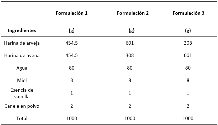 La harina de arveja y de avena se mezclaron hasta homogenizar completamente. Se continuó con la adición de canela en polvo, esencia de vainilla, miel y agua hasta integrarlos completamente para formar una masa. Después de esto, se procedió a moldear para obtener un producto tipo snack, el cual fue sometido a horneado por 20 min a temperatura de 120 °C. Finalmente, se sacaron del horno para dejar enfriar a temperatura ambiente. Ya alcanzadas el equilibrio térmico se almacenaron en bolsas de polietileno hasta su utilización.
