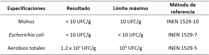 La presencia de coliformes totales del producto terminado se realizó mediante el método de ensayo BAM-FDA CAP #4 2002, cuyo límite máximo permitido para identificar el nivel aceptable y de buena calidad es de 30 UFC/g (INEN 1529-7).