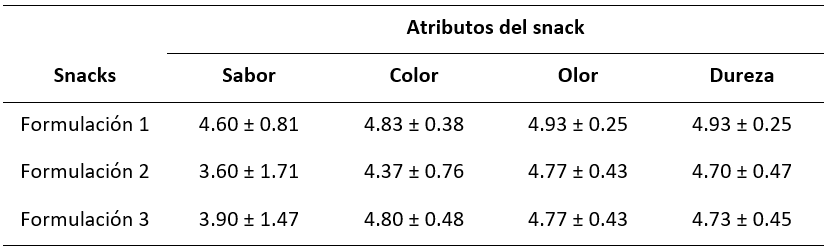 Se realizaron tres formulaciones para la elaboración de los snacks. Estas formulaciones se muestran en la Tabla 1.