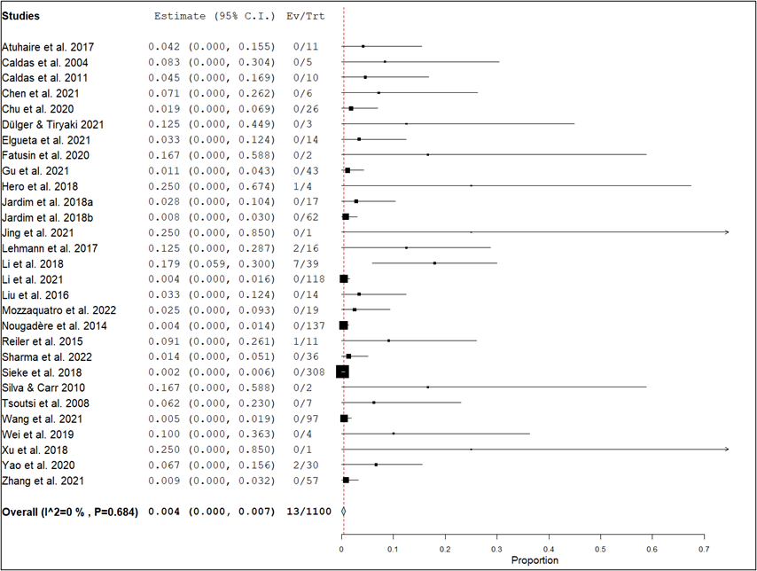 The average occurrence of active ingredient residues of pesticides in agricultural crops suggesting a potential health risk in the reviewed papers is of 0.004 and a 95% confidence interval (95% C.I.) in between 0.000 and 0.007. These figures indicate that out of 100 active ingredients tested for, 0.4% might pose an unacceptable risk for human health (Figure 2). The zero percent 95% C.I. (p=<0.684) indicates low heterogeneity, which means that all the evaluated papers presented similar results with reference to the residues of active ingredients classified as of an unacceptable risk.