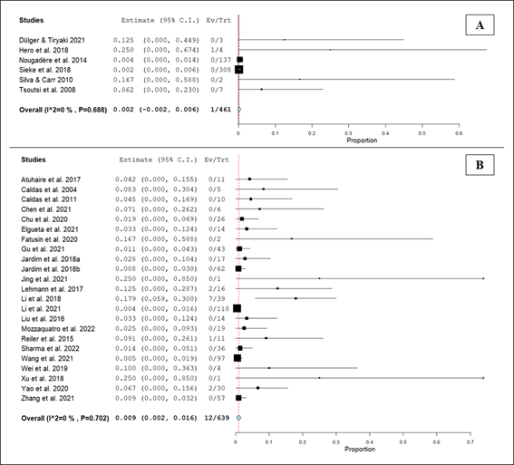 In developed countries, the average occurrence of active ingredients with an unacceptable risk was of 0.002 and a 95% C. I. in between (-)0.002 and 0.006. The average occurrence in less developed countries was 0.009 and a 95% C. I. in between 0.002 and 0.016 (Figure 3). In both subgroups no data heterogeneity was determined (zero percent). A p ≤0.688 for developed countries and a p ≤0.702 for undeveloped countries. Values of p are a probability measure in which values above 0.05 indicate that there is no significant statistical heterogeneity amongst the studies in every category of countries.