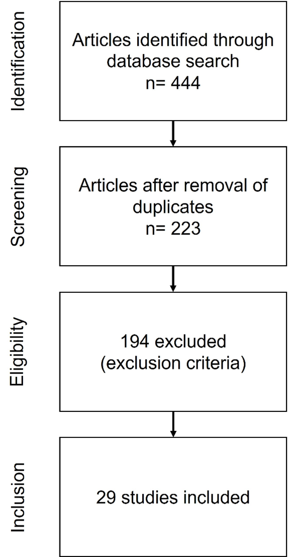 The systematic review returned 444 papers by the use of the mentioned index terms to search the databases. After sorting out duplicates, 233 papers remained, from which 29 papers were selected after applying the indicated prerequisites (Figure 1).