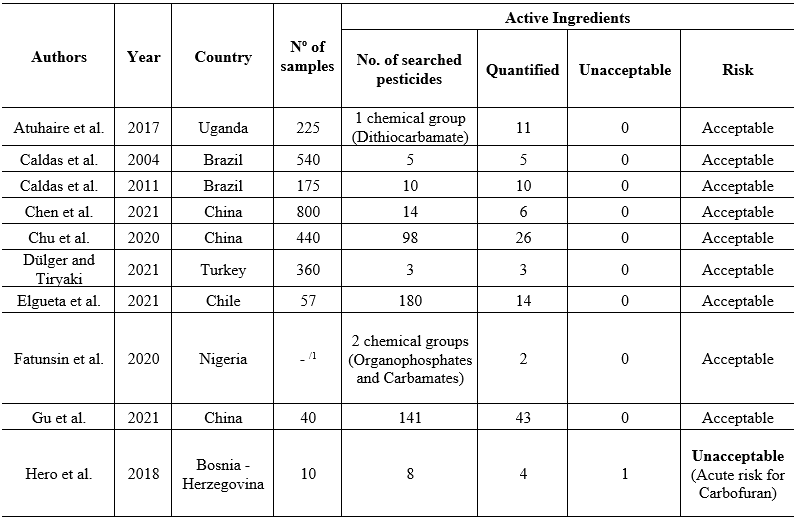 All the analyses in the listed publications quantified the active ingredients and in 24 papers (82.8%), the health risks determined were considered acceptable. That means that in the majority of the selected work the estimated ingestion of pesticide residues was below the safe limit for maximum daily intake of residues for every quantified active ingredient. In five papers (17.2%) were listed residues of pesticides posing a potential health risk to consumers.