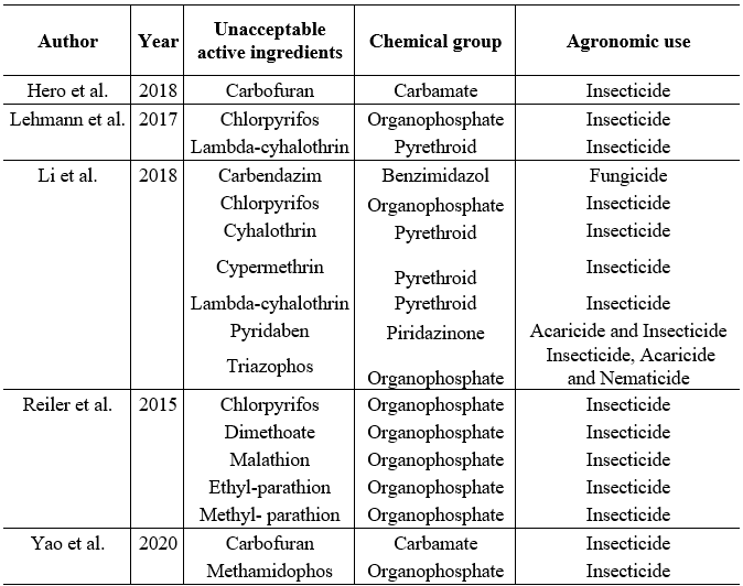 Both, chlorpyriphos and carbofuran are the most frequent active ingredients determined in the papers retrieved by the systematic review. Massive use of chlorpyriphos has caused soil, air and water contamination in many places of the world by way of industrial and agricultural processes release (Lakshmi et al., 2008). Carbofuran is highly toxic to humans and wildlife and, even though being easily degraded, might induce deleterious effects to non-target species before its environmental dissipation (Moreira et al., 2004).