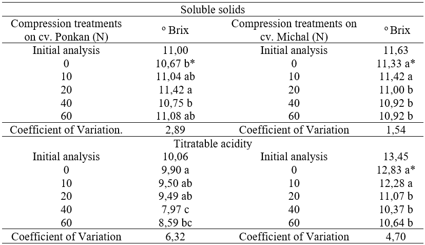 With regards to flavor, soluble solids and titratable acidity the main changes were observed on acidity contents. Soluble solids had only a slight reduction in response to the applied compression forces on cv. Michal tangerines. That result was not repeated on cv. Ponkan cultivar. (Table 3). Titratable acidity reduces in both cultivars. The decreases in acidity did result in increments of the sugar-acid ratios.