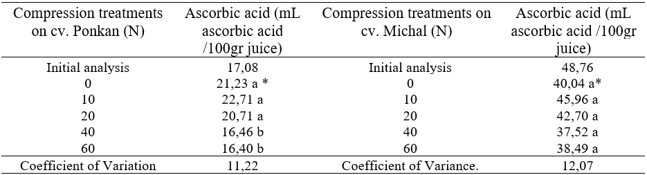 The dissimilarity of responses in ascorbic acid losses in between cv. Ponkan and cv. Michal may be related to morphological aspects of both cultivars. Cv. Ponkan with the segments only slightly adhered to the peel and also less packed segments turns the cultivar more likely to compression effects in comparison to cv. Michal.