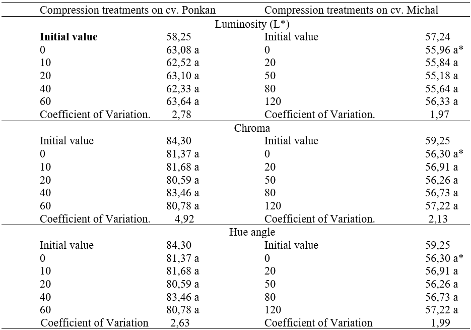 Peel color of the tangerines Ponkan had no modifications even when oleocelosis was observed. Healthy tissues did not show peel color changes (Table 6). Cv. Michal did also not have color changes attributable to compression forces.