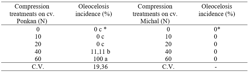 Oleocelosis incidence on Ponkan tangerines is dependent of the forces applied. Compression forces beyond 40N did result in the disorder while forces of 10 or 20 N did not result in oleocelosis (Table 2). On Michal tangerines no oleocelosis was determined even at the highest compression force applied. Oleocelosis is a physiological disorder on the epidermis of citrus fruit as a result of the rupture of oil glands releasing essential oils that are phytotoxic to the albedo cells (Knight et al., (2001)).
