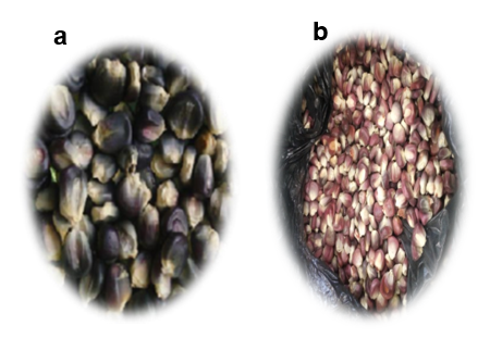 Se lograron obtener dos tipos de harinas crudas y nixtamalizadas sin tamizar y tamizadas. De este último proceso se tomó la harina retenida y la pasada para ambos tipos de maíces, dando un total de ocho muestras. Los granos empleados en este estudio se presentan en la Figura 1.