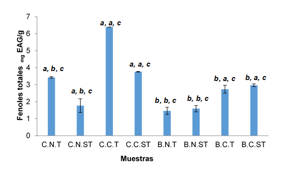 El proceso de nixtamalización tiene un efecto significativo en los compuestos fenólicos se observa que la harina de maíz criollo cruda tamizada (C.C.T) presenta el mayor contenido de compuestos fenólicos (6,40 mgEAG/g) mientras que la harina de maíz bolita (B.N.T) contiene 1,47 mgEAG/g, obteniendo como resultado un valor de (p<0,05) por lo tanto, si hay diferencia significativa, ya que los compuestos se ven directamente afectados por el proceso de nixtamalizado. Esto sugiere que durante el proceso se hidrolizan estructuran y que permiten la liberación de estos compuestos, que pueden irse en el lavado, reduciendo su cuantificación. Finalmente, el contenido de fenoles se no ve afectado por el tamizado.
