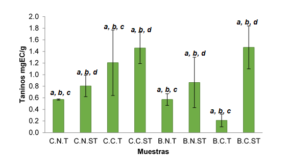 Los taninos condensados se encuentran como componente nutraceútico de los alimentos, proporcionando beneficios a la salud como prevención de enfermedades. Las harinas crudas presentaron un contenido de taninos condensados que varía de 0,57- 0,86 mg EC/g de muestra, mientras que las harinas nixtamalizadas presentaron de un intervalo 0,21 – 1,47 mg EC/g de muestra. En la figura 3, se aprecian los resultados de ambos tipos de maíces y procesos. El contenido de taninos condensados se ve afectados por el tamizado (p< 0,05). Por lo tanto, si hay diferencia significativa.