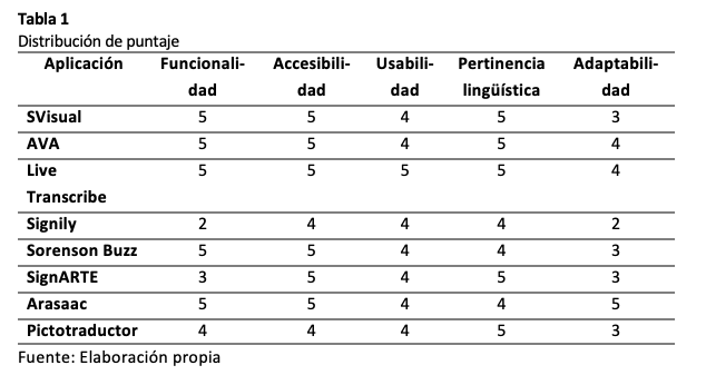 Posteriormente, en la etapa de filtrado, se seleccionaron aquellas aplicaciones que alcanzaron mejores puntuaciones, descartando las que no cumplían con los criterios mínimos establecidos. La selección final incluyó ocho aplicaciones que representan diferentes aproximaciones tecnológicas a la accesibilidad para personas sordas. Cinco de ellas se centran en la comunicación y accesibilidad auditiva (SVisual, AVA, Live Transcribe, Sorenson Buzz y SignARTE), ya sea mediante vídeo-interpretación, transcripción de voz en tiempo real o mediación visual de contenidos orales. La aplicación Signily, se clasificó como herramienta de apoyo lingüísticovisual, orientada a la comunicación escrita mediante alfabeto manual. Seguidamente, Arasaac y Pictotraductor fueron identificadas como traductores visuales, útiles en contextos educativos y multilingües para personas con baja alfabetización.