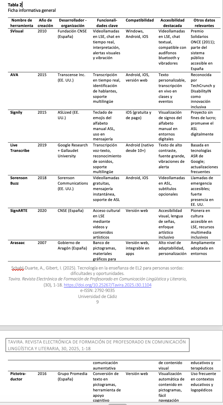 NOTAS: Este trabajo forma parte de una macroinvestigación en curso, cuyo objetivo es diseñar un prototipo de aplicación para la enseñanza del español como segunda lengua (L2) a personas sordas. Los resultados aquí presentados corresponden a una fase exploratoria, centrada en identificar y analizar herramientas digitales existentes con fines inclusivos. Esta etapa permitió establecer criterios de referencia y detectar vacíos funcionales. Si bien se evidencian tendencias relevantes, los resultados deben considerarse preliminares, sujetos a validación en fases posteriores del estudio.