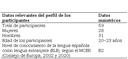 El perfil de los participantes en la investigación es el siguiente: se trata de 59 aprendices griegos de ELE del nivel B2, según el MCER (Consejo de Europa, 2002 y 2020), todos adultos, provenientes de un instituto privado de enseñanza de LE en Atenas. Todos son estudiantes universitarios de varias universidades ubicadas en la región de Ática. Los grados universitarios en los que estudia cada uno de los estudiantes no se vinculan con el estudio de lenguas. Los estudiantes son participantes potenciales en el programa de intercambio para estudiantes universitarios ERASMUS+, durante unos meses en España. Es necesario señalar que la posible participación de los estudiantes en este programa constituye el motivo principal por el que empezaron el aprendizaje de ELE. Normalmente, la estancia de los estudiantes en las Universidades participantes en este programa en cada convocatoria suele durar casi un semestre. La edad de los aprendices griegos de ELE, participantes en este estudio, oscila entre los 20 y 23 años. De los 59 alumnos de ELE, 28 son mujeres y 31 hombres (Tabla 1). El nivel certificado de conocimiento de la lengua española que suele exigir la mayoría de las Universidades españolas para la participación en el programa de intercambio de estudiantes universitarios ERASMUS+ es el B2, según el Marco Común Europeo de Referencia para las Lenguas (MCER, Consejo de Europa, 2002 y 2020). Todos los alumnos de ELE otorgaron su consentimiento por escrito para el uso anónimo de las respuestas obtenidas de las encuestas para fines de investigación educativa. La elección del lugar mencionado para la recogida de los datos se debe a la posibilidad de contar con más personas del perfil descrito en un momento dado.