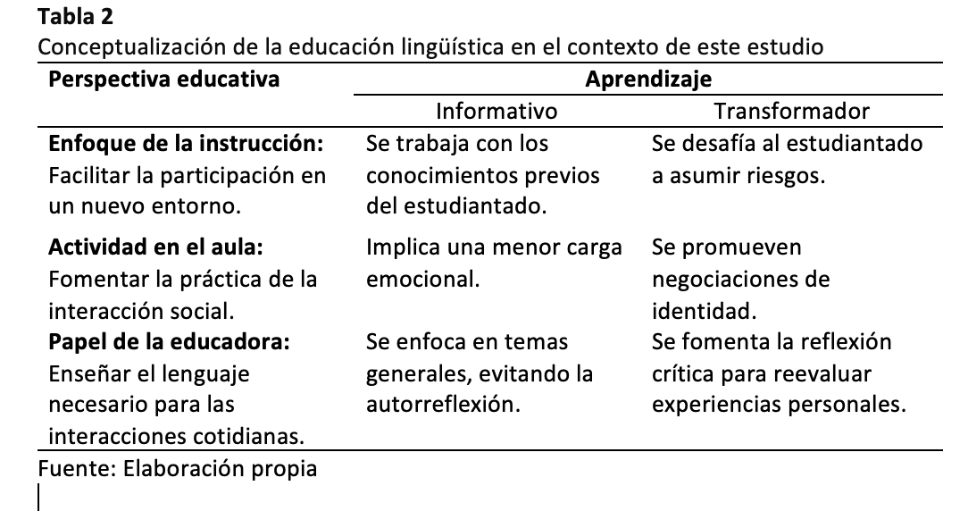 Dado que el aprendizaje de lenguas es un proceso profundo que exige esfuerzo y motivación frente a factores externos, se observa aquí una conexión con la teoría del aprendizaje transformador e informativo. Aunque no todo aprendizaje lo sea, bajo ciertas condiciones el aprendizaje puede llegar a ser transformador. La siguiente tabla describe los elementos que distinguen el aprendizaje informativo del transformador (Tabla 2).