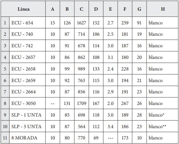 *Con manchas negras. **Con manchas amarillas. A = Días a la emergencia. B = Días a la floración. C = Rendimiento en kg/ha. D = Altura de planta en cm. E = Resistencia a Roya en % (Uromices lupini). F = Días a la cosecha. G = Número de vainas por planta. H = Color de grano.